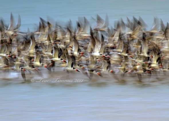 Since I’ve been having fun lately with slow shutter speeds, thought that I’d try it out with some Black Skimmers. Found several hundred of them hanging out at the east end of Galveston Island in the windy, cold weather (relatively speeking). They were in two different groups and would blast off every 10 minutes or so. Took this shot panning with the flock at 1/8 sec on shutter priority.