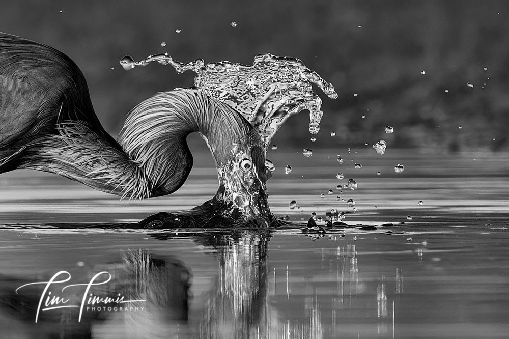 Reddish egret diving for fish in a tidal pond at Bolivar Flats Audubon Shorebird Sanctuary. While heading back to my car after a successful early morning taking shorebird photos, found this reddish egret that was catching some small fish in a separate small tidal pool. Got some very cool splash shots but didn’t like the background so converted this one to B&W and cropped in on the splash.