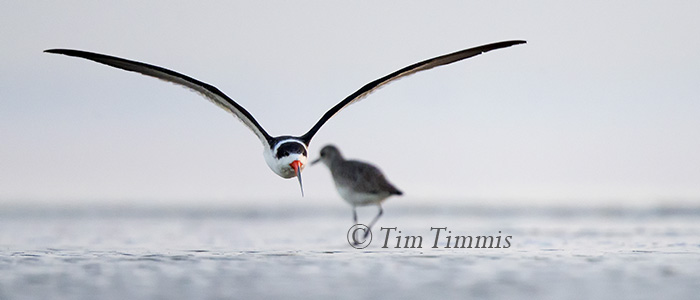 The Black Skimmer experience was a first for me as I got buzzed and circled by two Skimmers. While walking back to my car, heard the distinctive barking of incoming Skimmers. Took my camera off of the ground pod and got ready for some flight shots. Was surprised when the skimmers flew towards me and then circled very close three times before flying further down the beach and landing. Apparently they like me lying down better.