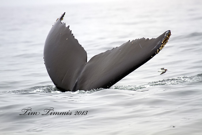 A different angle showing the jagged edge of the tail, barnacles on the tail and a bird flying underneath it.