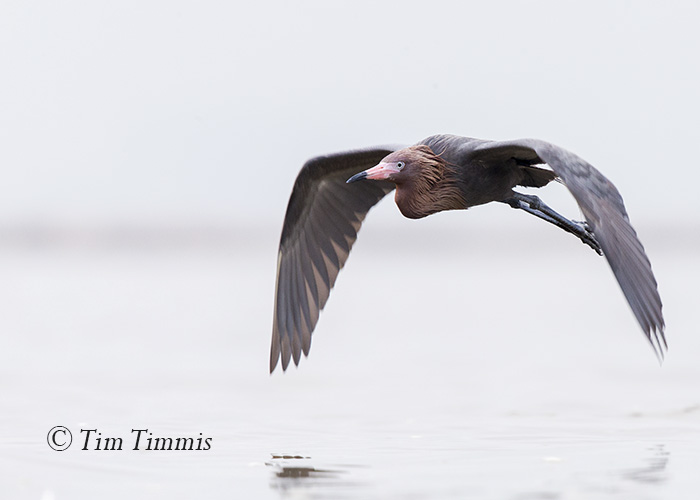 Further down the beach, I spotted a Reddish Egret standing near the shoreline. We made him our next objective and got into position, hoping for some fishing action. He then just basically stood there on one foot looking around and occasionally squawking. After a while, I mentioned to the group that we could stay and wait for him to move or go back to the Skimmers. He then quickly took off and headed back up the beach past the Skimmers. My initial reaction was that he took off because I stated talking. However, he ended up flying off to confront a White Morph Reddish Egret. Reddish Egrets are very territorial and don’t like company when feeding.